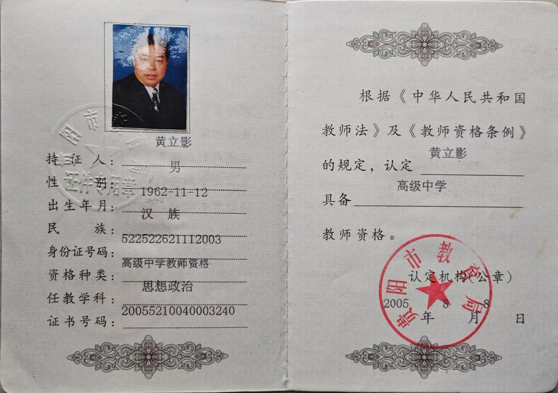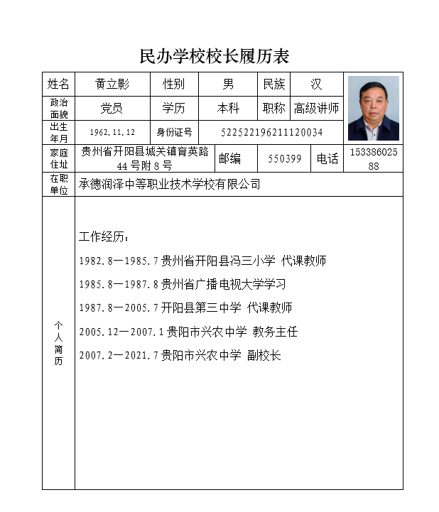 黄立影,男,汉族,1962年11月出生,中共党员,大学本科学历,贵州省开阳县人,高级讲师职称。